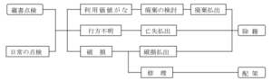図書館で入手した図書を図書原簿に登録する。 2分類(p10-30、p10-49) 図書をその扱っている内容により類別する。 3目録(p10-35) 図書に関する記録を作成して一定の順序に配列する。 4装備(p10-38) 図書に印を押しラベルを貼るなど手を加える。 5配架(p10-41) 以上の作業が終了した図書を書架上に一定の順序に配列する。 6蔵書点検(p10-43) 蔵書として利用価値があるかないかの再評価と、図書台帳に登録されている本が実際にあるかどうかの点検の二つの目的のために行う。 7払出(p10-46) ①棄損②亡失③廃棄④保管転換⑤寄贈⑥数量更正などの理由で、該当の本を除籍する。 |