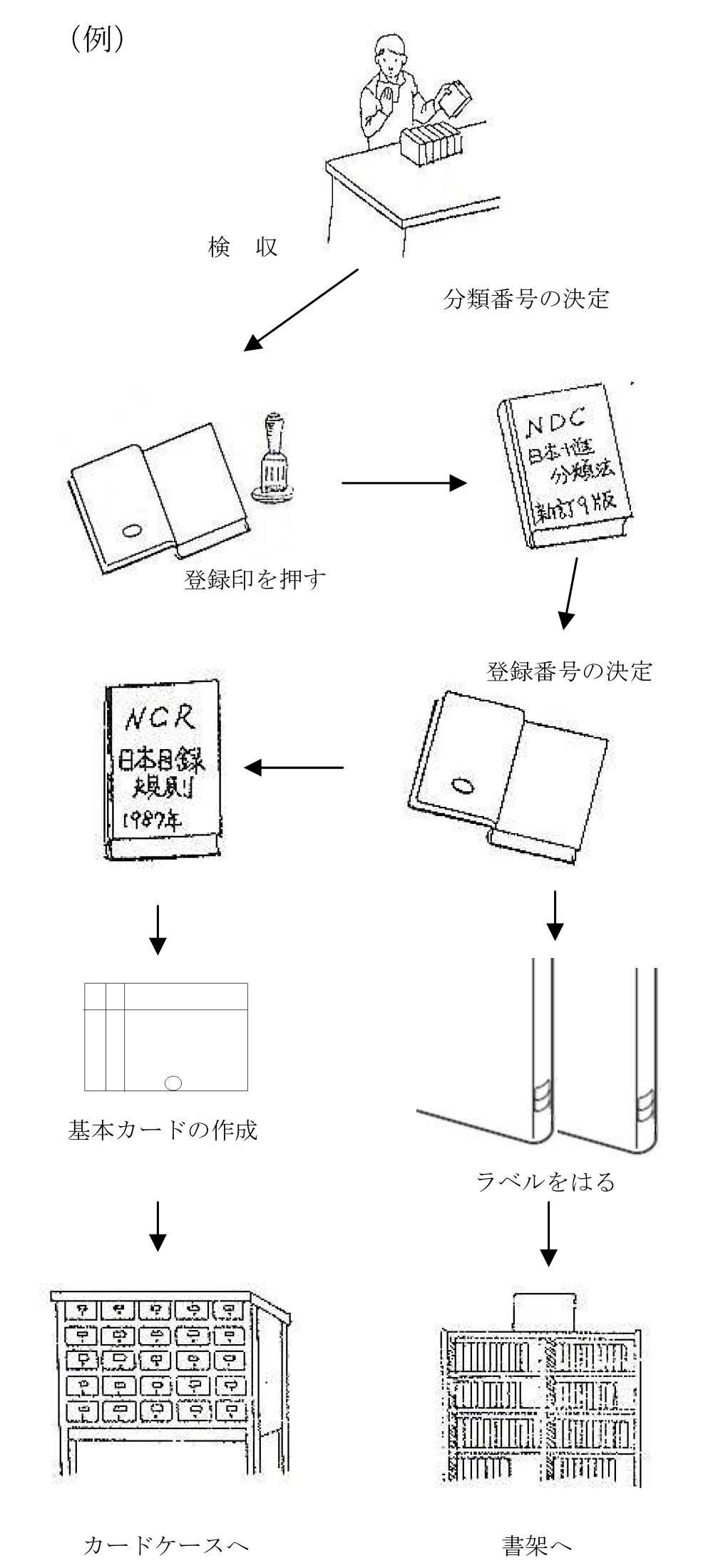 図書館で入手した図書を図書原簿に登録する。 2分類(p10-30、p10-49) 図書をその扱っている内容により類別する。 3目録(p10-35) 図書に関する記録を作成して一定の順序に配列する。 4装備(p10-38) 図書に印を押しラベルを貼るなど手を加える。 5配架(p10-41) 以上の作業が終了した図書を書架上に一定の順序に配列する。 6蔵書点検(p10-43) 蔵書として利用価値があるかないかの再評価と、図書台帳に登録されている本が実際にあるかどうかの点検の二つの目的のために行う。 7払出(p10-46) ①棄損②亡失③廃棄④保管転換⑤寄贈⑥数量更正などの理由で、該当の本を除籍する。 |