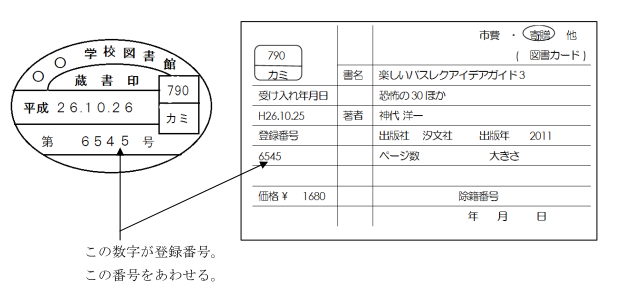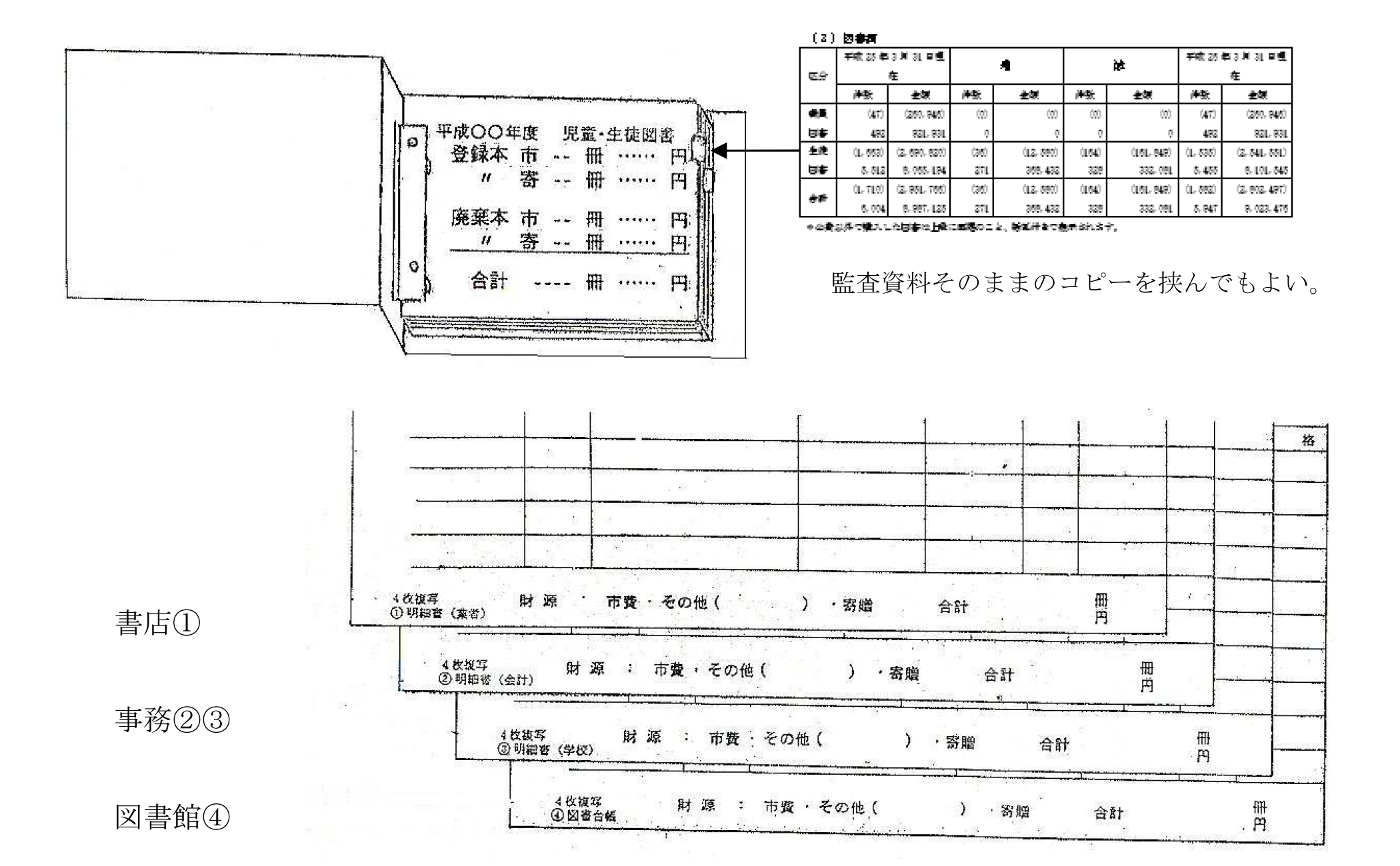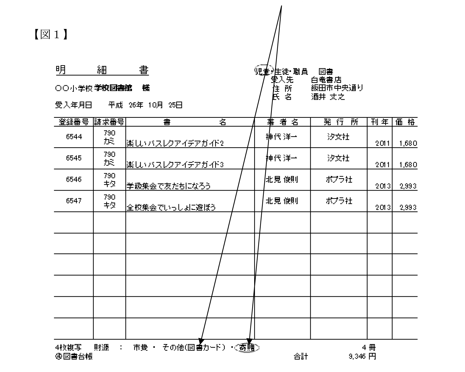 *ただし、再販売価格等で購入した本については学校で台帳を作成し、それぞれの本の税込み価格を記載する。尚、端数は最後に記載した本のみで調整する。端数調整した本は基本カード記入時に金額欄横に(端数調整)と記入しておく。【寄贈の場合】